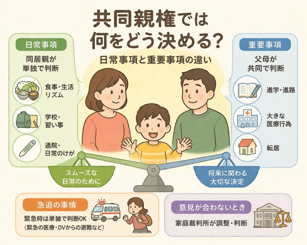 一方で、子どもの将来に大きな影響を与える事項については、父母が共同で判断することが求められます。進学先の選択や重要な医療行為、転居といった判断が典型例です。これらは一度の決定が長期的な影響を及ぼすため、双方の関与のもとで慎重に決めるべきものとされています。